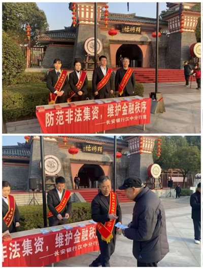 为进一步增强社会公众对非法金融活动的防范意识和识别能力,维护广大人民群众根本利益。长安银行汉中分行紧扣在春节假日期间,聚焦周边社区、企业客户、惠农网点、景区、厅堂客群、公益群体,组织各机构开展防范非法金融“七进”宣传教育活动。