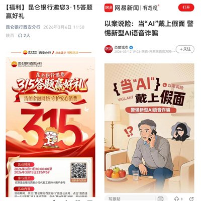 线上线下齐联动,寓教于乐传知识。自3月起,西安分行充分发挥线上平台传播优势,打造多元化线上消保宣传矩阵。3月11日至15日,在权益平台开展“315答题赢好礼”活动,以答题闯关的形式普及消保常识,展现“昆仑源保”消保子品牌及理念,吸引消费者积极互动;针对老年群体易受AI语音诈骗侵害的特点,分行制作“以案说险:当AI戴上假面 警惕新型AI语音诈骗”主题反诈漫画,于3月12日在网易新闻平台发布,以“案例警示+通俗解读”的形式,实现反诈知识的精准传递与广泛覆盖,打破传统宣传模式局限。