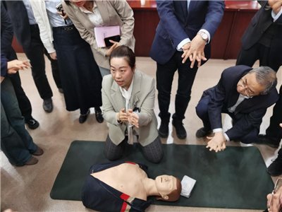 在急救实操环节中,参训员工在唐佩主任的专业指导下,集中练习了胸外按压、人工呼吸的标准动作及 AED 配合使用,现场互动积极,气氛热烈。大家一致认为,此次培训“干货满满、贴近实际” ,不仅显著增强了对心源性猝死的防范意识,更掌握了在关键时刻能施以援手的“硬核”技能。