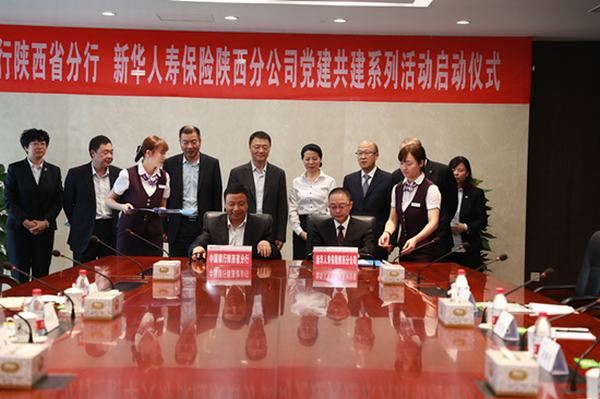 中行陕西省分行与新华人寿保险陕西分公司举行党建共建系列活动启动仪式 9月8日,中国银行陕西省分行与新华人寿保险陕西分公司在省行中银大厦举行党建共建系列活动启动仪式,现场签署《党建共建协议书》。陕西省分行党委书记、行长吴敏同志,党委委员、副行长牛长平同志,新华人寿保险陕西分公司党委书记、总经理刘晓芳同志,党委委员、副总经理季新军同志共同出席本次启动仪式。 仪式开始前,吴敏行长、牛长平副行长及刘晓芳总经理一行在省行18楼行史展览室,共同参观了陕西省分行百年历史沿革,观看了行史展览室中的珍贵史料。 观看结束后,本次启动仪式在行务会议室正式开始。会上省行党务工作部向刘晓芳总经理一行介绍了中行陕西省分行特色党建工作开展情况,汇报了陕西分行“一个目标、三个融入、两个平台、四种力量”的工作特点;省行金融机构部对于双方党建共建“星火燎原促业务、精准扶贫肩责任、舆情防御建和谐、百人培训谋发展”系列活动开展的整体思路进行了重点阐述;新华保险就系列活动开展中的具体做法进行了专项汇报。 吴敏行长对陕西中行与新华人寿保险陕西分公司签署《党建共建协议书》表示祝贺。对新华保险陕西分公司成立15年来取得的发展成就表示赞叹。吴行长指出,当前国家政策明确提出让保险回归风险保障功能的监管导向,目的是让保险行业真正成为国家发展的稳定器、人们生活的保障器、实体经济的助推器。新华人寿保险陕西分公司积极参与公益慈善事业,自觉履行社会责任,为促进社会和谐进步和改善人民生活质量做出了不懈的努力,这与中行“担当社会责任 做最好的银行”发展理念高度契合。期待新华保险与中国银行党建共建系列活动圆满成功,全面开创新型的银保合作新格局。 刘晓芳总经理对双方长期以来的良好合作给予高度评价并表示感谢,对中国银行重视党建工作、开展党建创新的举措表示钦佩,希望下一步双方能够在多领域进一步加深合作。 最后,在吴敏行长和刘晓芳总经理的见证下,牛长平副行长和季新军副总经理分别代表中国银行陕西省分行和新华人寿保险陕西分公司签署了《党建共建协议书》。