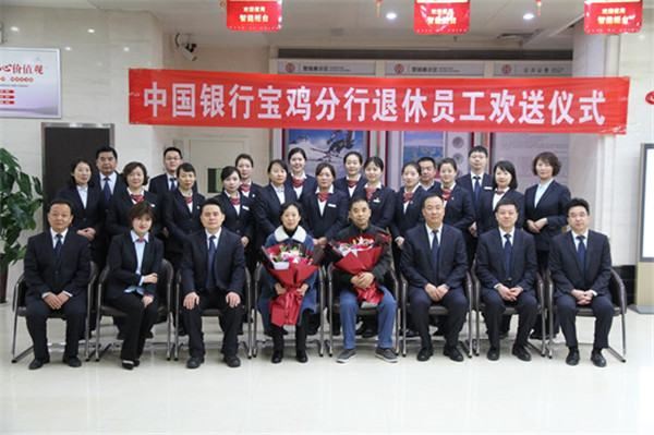 | 1月8日清晨,中行宝鸡分行为新退休的两位同志举行欢送仪式,行领导和30余名员工代表齐聚营业部大厅参加活动。