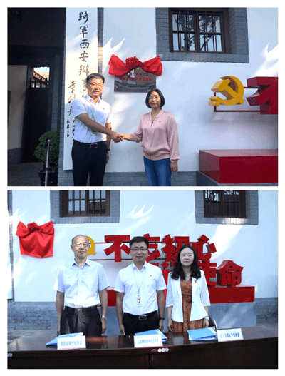 揭牌仪式上,陕西省保险行业协会秘书长惠青、陕西省银行业协会副秘书长张保强与西安办事处纪念馆馆长陈斌签订了共建协议,陕西银保监局纪委副书记、纪委办公室主任马雪芹与八路军西安办事处纪念馆馆长陈斌共同为基地揭牌。