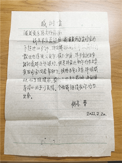 2022年2月19日,曹大爷急匆匆走进浦发银行西安长乐路支行,表示自己卡上50万元不见了。柜员小田热情接待,一边安抚曹大爷,一边帮助曹大爷打印近两年的流水,帮助大爷回忆每一笔资金的往来。期间,小田注意到曹大爷听力不好,于是尽量放慢语速,用纸笔耐心地和大爷交流。最终,大爷记起一年前和老伴一同购买了一笔50万元的理财。大爷终于放下心来,连声感谢。第二天一大早,曹大爷专程送来了一封感谢信。