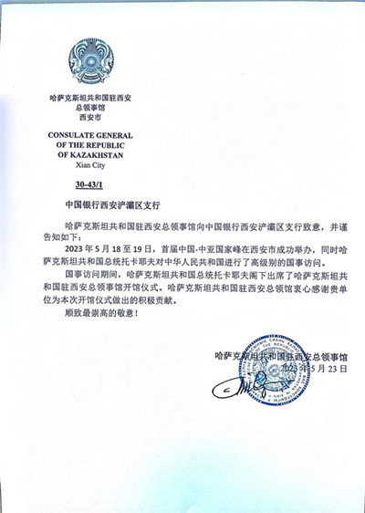“衷心感谢贵单位为本次开馆仪式做出的积极贡献,顺致最崇高的敬意!”5月23日,中行陕西省分行(以下简称“陕西中行”)辖属西安浐灞区支行收到了来自哈萨克斯坦共和国驻西安总领事馆的感谢信。