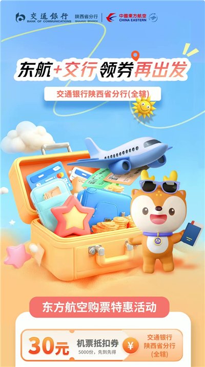 在国家全力促进消费复苏与升级的背景下,出行消费正成为拉动内需的重要动力。10月22日,交通银行陕西省分行与东方航空合作成功上线“交行APP购东航机票满300减30”专属优惠活动。合作历时4个月,双方共同整合优势资源,通过数字化平台加码消费优惠,助力人民群众美好生活。