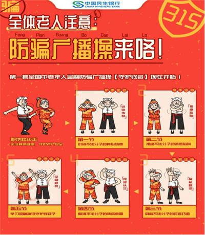 根据监管机构和民生银行总行关于开展2021年全国银行业和保险业“3·15”消费者权益保护教育宣传周活动的通知要求,民生银行西安分行围绕活动焦点,积极策划,全行动员,全方位、多视角开展“3·15”消费者权益保护教育宣传周活动。 今年宣传活动主要聚焦“一老一少”,分行针对老年群体,前期与人民银行西安分行积极沟通,创新策划“315全国首套老年防骗广播操”,共包括护眼运动识别伪装、伸手运动拒绝陷进、扭转运动屏蔽瞎话、垫脚运动拒绝从众、踢腿运动不占便宜、整理运动全副武装六节内容,该作品通过精心设计、趣味包装,使用寓教于乐的形式在全国上万部优秀作品评选中被人民银行总行官方微信公众号采用并在全国发布,获得了监管机构的高度认可。