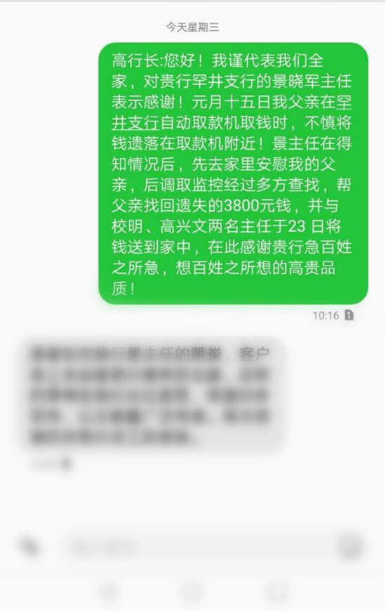 1月24日,也就是中国传统的腊八节,老人女儿执意要和父亲为工行罕井支行送来感谢信,她表示,工行人热情服务,全力以赴寻找丢失的钱,并将钱款送到自己家的精神感动了她们,为这种精神送上感谢信。同时,她们还要向工行行长发去短信,以赞扬罕井支行员工的真情服务。