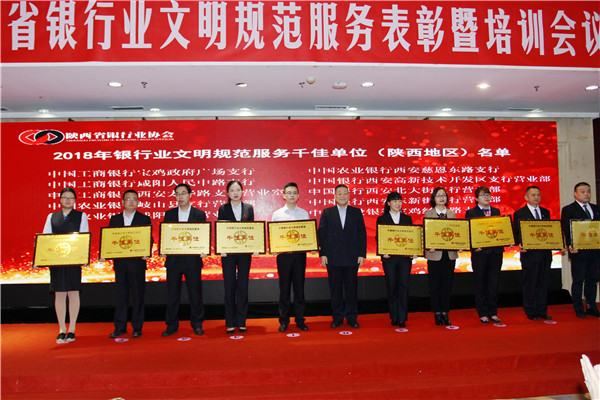 表彰会上,中国工商银行宝鸡政府广场支行、中国工商银行咸阳人民中路支行等30家机构荣获全国银行业文明规范服务“千佳示范单位”称号,中国建设银行神木人民广场支行、邮储银行西安市北关支行等15家机构荣获陕西省银行业文明规范服务“示范单位”称号。